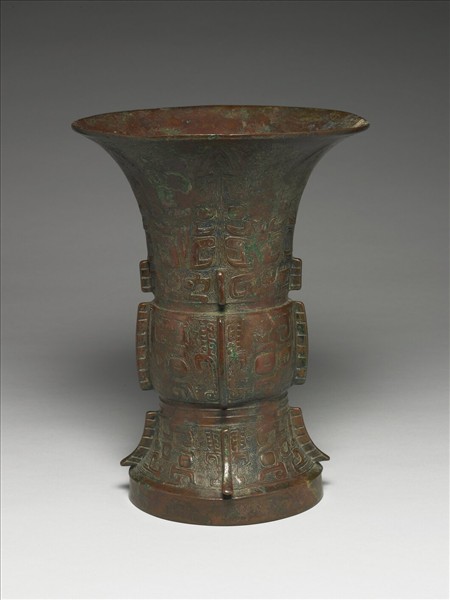 此尊由頸、腹至圈足,四面各附棱脊,腹內作圓凹底。腹部以飾卷角的「獸面紋」為主,圈足則飾左右展角的「獸面紋」,頸飾蕉葉形「獸面紋」,頸腹之間飾一道右向的「夔龍紋」。銘文三字,鑄於圈足內壁,其右邊的「東」字,可能用為族徽。左邊銘文直行二字,「乙父」與「父乙」同,全銘意即「東」這個家族,為宗廟內祭祀「父乙」而作此盛酒禮器。