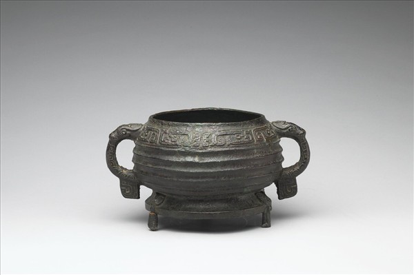 斂口,雙耳,圓腹,圈足,耳做獸首形,下有附珥,圈足下有三小足。口沿下有一圈竊曲紋飾帶,器腹為瓦溝紋。