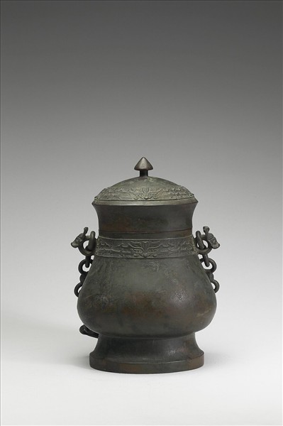 圓卣,附蓋,子母口,縮頸,鼓腹,圈足,蓋鈕作菌狀,頸側出小獸首環耳,耳內穿鍊形提粱。蓋、頸飾獸面紋。蓋、器內有銘二行。