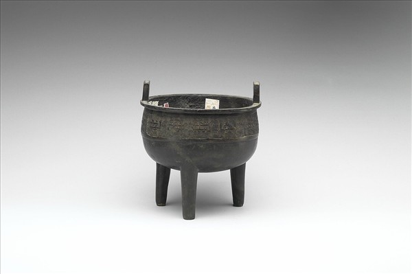 圓鼎,盤口,立耳,柱足。腹飾夔紋,以雷紋為底。