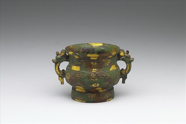 圓簋,盤口,雙耳,圓腹,圈足,耳做獸首形,下有附珥。口沿、腹與圈足飾夔紋。全器多處有鎏金,並覆蓋厚綠鏽。