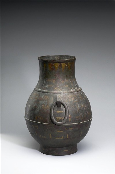 圓壺,鼓腹,圈足,肩上二方折耳。全器以異金屬鑲嵌雲雷紋。