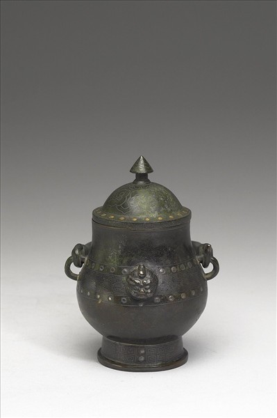 小巧而精緻的晚期鑄件,造型靈感來自商代銅卣,但體積十分小巧。表面以銀絲嵌錯雷紋、雲頭紋,局部錯金加強裝飾效果。這類小型銅卣可能即為高濂在《遵生八牋》卷十五〈糊斗〉一條所提到的「用銅者為佳,以便出洗。有古銅小提卣,如一拳大者,上有提梁索股,有蓋,盛糊可免鼠竊。」