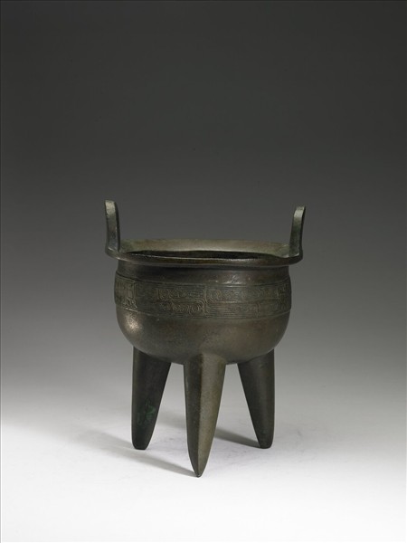 侈口,雙耳,錐足。腹飾目雷紋,以雲雷紋為地。腹範線明顯。