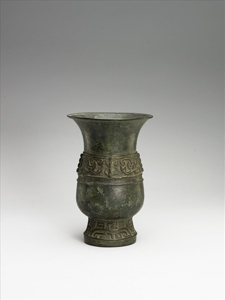 觶,侈口、鼓腹、圈足微撇,頸有棱脊。頸飾鳥紋、弦紋,足飾竊曲紋。