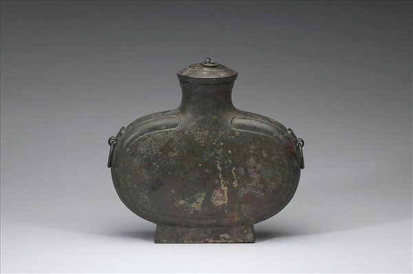 扁壺,附鈕蓋,帶環鈕,盤口,短頸,斜肩,扁腹,方圈足,器肩兩側有銜環鋪首。
