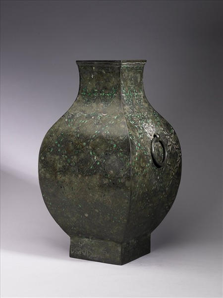 方壺,微侈口,直頸,溜肩,圓腹,方形圈足,兩側有獸首啣環耳。頸部飾三角雲紋,腹部以8字形圈帶紋劃成菱格狀,圈足飾雲紋,頸部與腹部紋飾部分鑲嵌孔雀石,多有脫落。