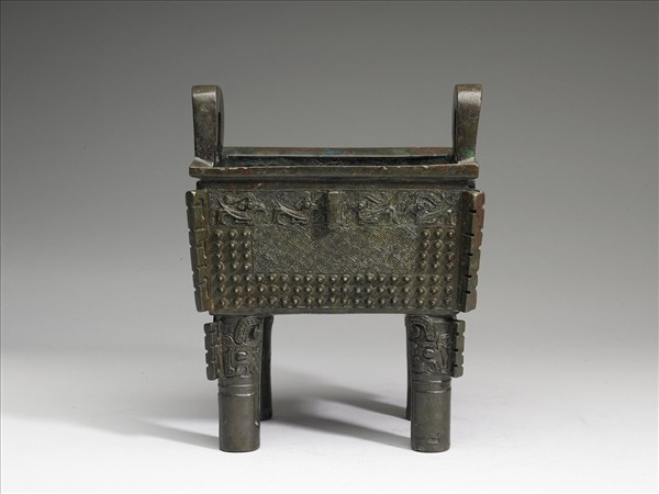方鼎,腹足皆有鉤狀棱脊。頸飾鳥紋,鳥紋高鼓,下有雷紋襯底。腹飾尖錐狀乳丁及鉤連雷紋,足飾複層獸面紋,下有弦紋二道。器耳外側飾有單層淺刻夔紋。亞醜銘文在腹壁。