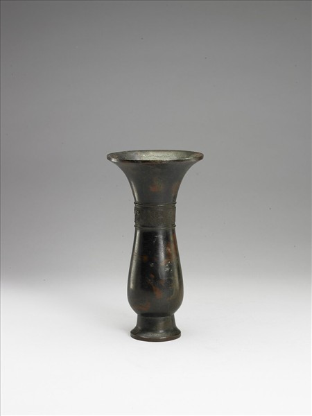 觶,侈口,長頸,鼓腹,圈足微撇。頸飾獸面紋。