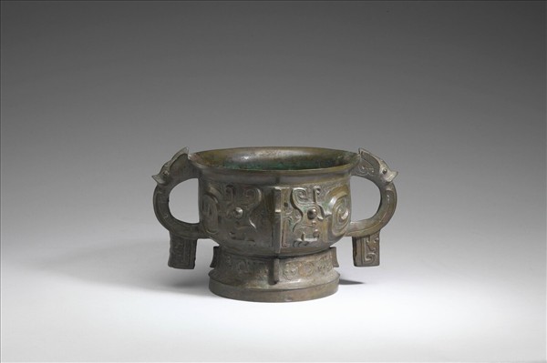 侈口,雙耳,圓腹,圈足,獸首半環耳下垂方珥,腹、足有棱脊。腹飾左右相對的蝸身獸紋,足飾蛇紋,以雲雷紋為地。附木蓋。