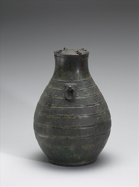 圓壺,平頂蓋,直口,長頸,斜肩,圓腹,圈足,器頸兩側有鋪首銜環,蓋面有四小耳,耳做獸首形,帶環。蓋頂與器腹飾蟠螭紋。