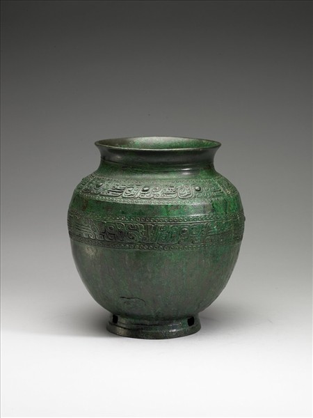 侈口,短頸,豐肩,圓腹,圈足外撇。肩部有一道由數個夔紋串連而成的紋飾,腹部有一道由兩組對夔紋形成的紋飾,上下皆有圈紋裝飾,圈足有三孔,可能是鑄造時連接內外範之處。