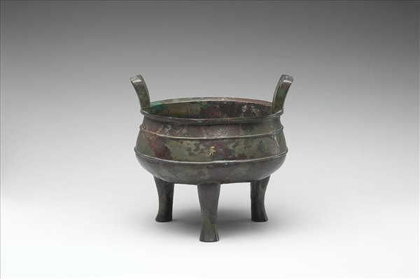 圓鼎,盤口,立耳外撇,三足。腹飾弦紋兩道。器底有銘。