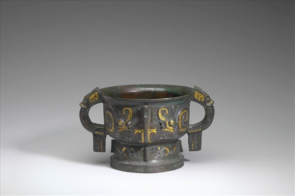 圓簋,侈口,雙耳,圓腹,圈足,耳作獸首形附珥,腹、足有棱脊。主體紋飾錯金,腹飾渦身獸紋,足飾夔紋,以雷紋為地。器內有銘一字。