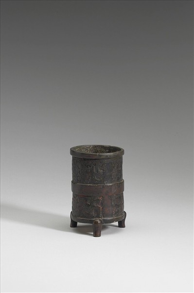 卮,圓筒形器身,深直壁,平底,三獸足。器外壁飾卍字與變形渦紋之紋飾帶。
