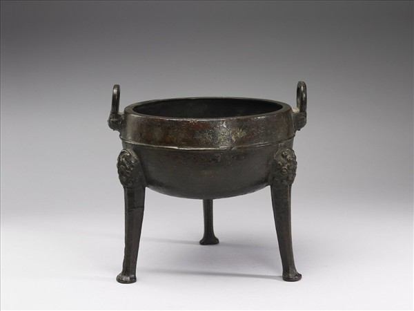 鼎,直口,附耳,圓腹,獸足。耳與器腹交接處飾獸首,腹中央有一道凸弦紋,弦紋旁有銘文。