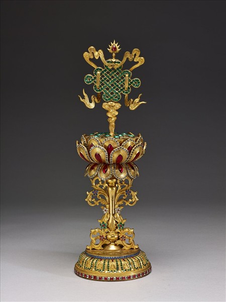 鍍金吉祥結上嵌以各色假鑽,挺立於嵌滿各色假鑽之鍍金蓮花之上,花下之卷葉及蓮瓣紋臺座上亦嵌以各色假鑽。