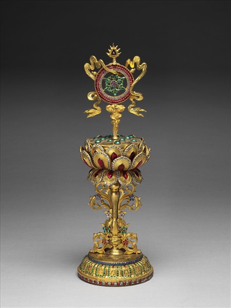 鍍金寶輪嵌以各色假鑽,挺立於嵌滿各色假鑽之鍍金蓮花之上,花下之卷葉及蓮瓣紋臺座上亦嵌以各色假鑽。