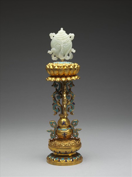 以青玉雕成寶螺置於一朵盛開之鍍金蓮花上,花心之蓮實填以淺藍色琺瑯釉彩,花下以四片卷葉承托插於葫蘆瓶中,卷葉及瓶外之飄帶中亦填以淺藍色琺瑯,瓶上則有以深藍色琺瑯填成之「大吉」二字,瓶下為圓形仰覆蓮瓣紋臺座,座面刻水波紋,蓮瓣中亦填以藍色琺瑯釉彩。