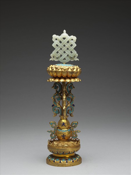以青玉雕成吉祥結置於一朵盛開之鍍金蓮花上,花心之蓮實填以淺藍色琺瑯釉彩,花下以四片卷葉承托插於葫蘆瓶中,卷葉及瓶外之飄帶中亦填以淺藍色琺瑯,瓶上則有以深藍色琺瑯填成之「大吉」二字,瓶下為圓形仰覆蓮瓣紋臺座,座面刻水波紋,蓮瓣中亦填以藍色琺瑯釉彩。