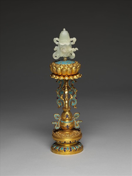 以青玉雕成勝利幢置於一朵盛開之鍍金蓮花上,花心之蓮實填以淺藍色琺瑯釉彩,花下以四片卷葉承托插於葫蘆瓶中,卷葉及瓶外之飄帶中亦填以淺藍色琺瑯,瓶上則有以深藍色琺瑯填成之「大吉」二字,瓶下為圓形仰覆蓮瓣紋臺座,座面刻水波紋,蓮瓣中亦填以藍色琺瑯釉彩。