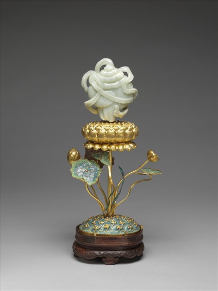 寶螺係由整塊白玉雕刻而成,並雕有飛揚纏繞之飄帶,玉下承以一朵盛開之鍍金蓮花,花下並有鍍金蓮實、含苞之蓮花、及蓮葉數莖挺立在圓形臺座之上,蓮葉及臺座上之水波紋間均填燒藍、綠色釉彩。