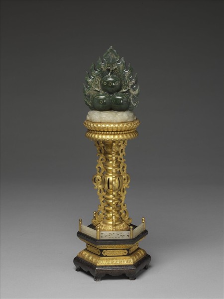 寶珠以碧玉雕成,細部紋飾間並描以金漆,置於白玉之上,玉上滿雕雲紋,玉下為鍍金仰覆蓮座,其下承以鍍金凸腹圓柱及四片卷葉,底座為八角形嵌銀絲銅座,座上嵌透雕白玉欄杆。