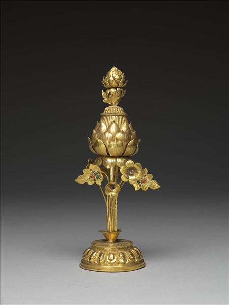 鍍金蓮花置於盛開且已結實的蓮花之上,蓮莖外挺立數朵小花及葉片,花心及葉片上均嵌有紅、綠色料珠,花下設圓形蓮瓣紋臺座,座面刻水波紋。
