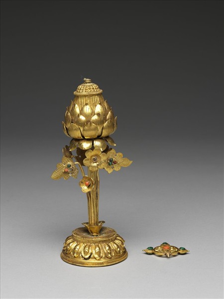鍍金寶輪置於盛開且已結實的蓮花之上,蓮莖外挺立數朵小花及葉片,花心及葉片上均嵌有紅、綠色料珠,花下設圓形蓮瓣紋臺座,座面刻水波紋。