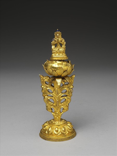 玉女頭戴五葉冠,雙手合什,瘦腰,具藏地風格,結跏趺坐於蓮座上,置於盛開之蓮花上,花下以卷葉承托置於圓形臺座上,臺上浮雕蓮瓣紋。