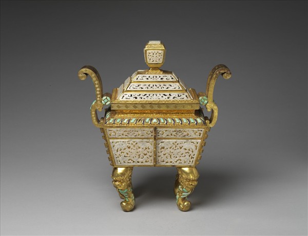 香爐作方鼎形式,兩側有附耳高出口沿甚多,器下承四蹄形足。蓋與器身均嵌以透雕纏枝紋白玉片,器身肩部則嵌以綠松石雕成之蓮瓣及藍色料片,附耳及四足上亦嵌以綠松石。