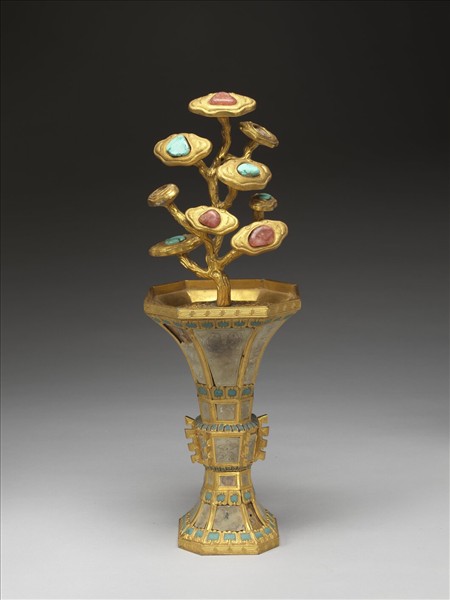 八方體銅觚,通體嵌白色料片,料片上刻蓮花及回紋,間隔之蓮瓣中則填以藍色琺瑯,瓶中插金漆靈芝,靈芝上嵌以綠松石及碧璽。