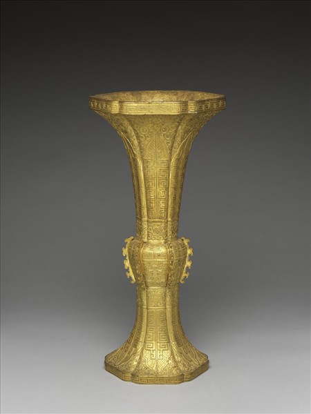 喇叭形花瓶,侈口束頸及高圈足,器形仿自商周時代之酒器銅觚,但剖面呈六瓣葵花形以配合整體風格,全器飾回紋、蓮花及內填回紋之蕉葉紋。