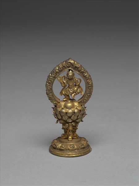 供養天女是佛國天界中的侍女,因此在佛畫或造像中一般多居於陪襯的位置,像這樣做為單獨的造像,雖然形體不大,也是十分罕見的,面容渾圓飽滿,長眉圓眼均描黑,下巴短小,接近西藏或尼泊爾一帶之風格,藍色髮髻上戴三葉冠,胸前垂有瓔珞,身上之天衣飄拂,手中拿著圓鏡,身外環以桃形光焰,以舞立姿單足立於蓮花座上,宛若隨樂聲翩然起舞。