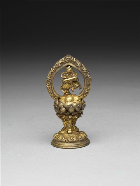 供養天女是佛國天界中的侍女,因此在佛畫或造像中一般多居於陪襯的位置,像這樣做為單獨的造像,雖然形體不大,也是十分罕見的,面容渾圓飽滿,長眉圓眼均描黑,下巴短小,接近西藏或尼泊爾一帶之風格,藍色髮髻上戴三葉冠,胸前垂有瓔珞,身上之天衣飄拂,手中拿著哈達,身外環以桃形光焰,以舞立姿單足立於蓮花座上,宛若隨樂聲翩然起舞。