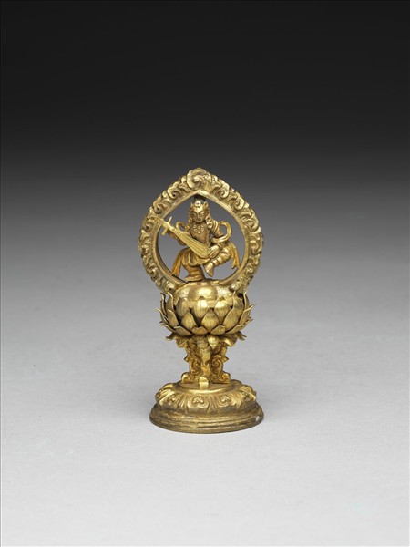 供養天女是佛國天界中的侍女,因此在佛畫或造像中一般多居於陪襯的位置,像這樣做為單獨的造像,雖然形體不大,也是十分罕見的,面容渾圓飽滿,長眉圓眼均描黑,下巴短小,接近西藏或尼泊爾一帶之風格,藍色髮髻上戴三葉冠,胸前垂有瓔珞,身上之天衣飄拂,手中拿著琵琶,身外環以桃形光焰,以舞立姿單足立於蓮花座上,宛若隨樂聲翩然起舞。