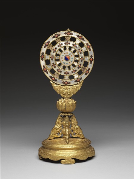 圓輪上滿嵌螺鈿及料珠,輪心並以橘、藍二色料片嵌出太極圖案,其外環以呈放射狀之十二道輻輳,輪外沿遺有洞孔,故知原本應飾有一圈火珠,可惜均己不存。輪下有卷葉及蓮花,蓮花下有雙葫蘆瓶及四片卷葉承托置於水波紋圓座上,座沿雕纏枝蓮花。