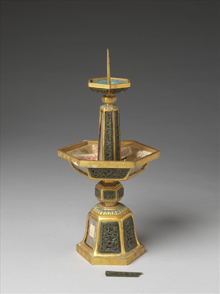 銅鍍金嵌玉及填料燭台(五供)