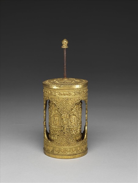 器作圓筒形,分作內外兩層,器上滿雕蓮花、寶珠及卷葉紋,外層鏤空,內層圓筒中放置經卷,外壁並刻以六字真言,筒底刻一枚十字金剛杵,內外二層間以鐵軸相貫可以旋轉,圓筒每旋轉一次即代表誦唸六字真言及經文一遍,因此也被稱作祈禱輪。
