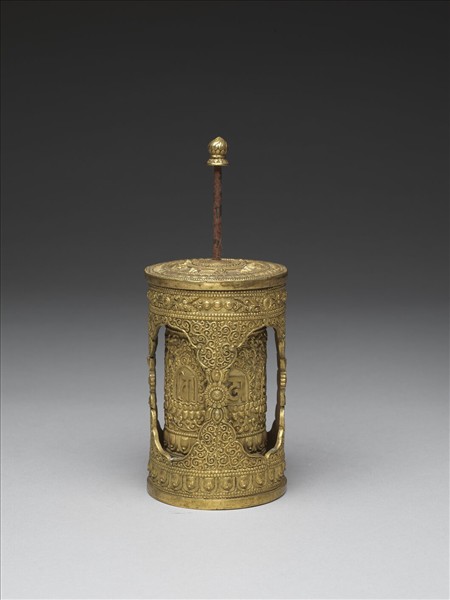 器作圓筒形,分作內外兩層,器上滿雕蓮花、寶珠及卷葉紋,外層鏤空,內層圓筒中放置經卷,外壁並刻以六字真言,筒底刻一枚十字金剛杵,內外二層間以鐵軸相貫可以旋轉,圓筒每旋轉一次即代表誦唸六字真言及經文一遍,因此也被稱作祈禱輪。
