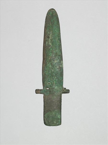 銅製戈,援底與內同寬,上下刃及尖端皆磨成鋒刃,脊位於援身中間,無胡,帶上下欄,直內。全器鏽蝕,援身斷裂。柄部墨書「NO.361」、「sapele」。