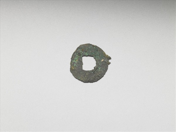 銅製錢幣,器身扁平,邊緣不甚規則。外周緣為圓形,中央帶一方形穿孔。銅錢一面由右而左印鑄「半兩」字樣,另一面平素無紋。