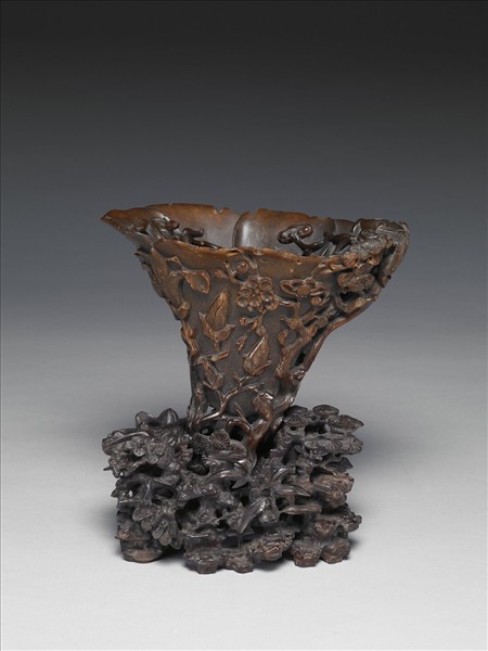 倒三角形杯,外壁浮雕折枝梅花、木蘭及松樹,一螭龍口啣靈芝趴於杯緣,身體延伸出杯外,對面杯緣內有一小螭龍,回首與之對望。杯底尖,如雙獸足交疊,無法立起,需置於附件之歲寒三友木座上。