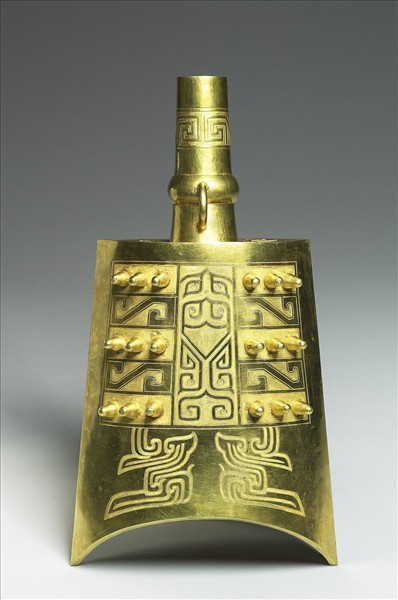 銅質,金黃色。鐘,幾何化紋飾由繁複的青銅紋飾簡化而來。此鐘配有一木座,顯然已與早期作為樂器的意義大相逕庭。