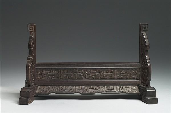 木質,兩足作几形,應為插屏之底座。器表滿飾雲紋組成的獸紋,雕工細整。