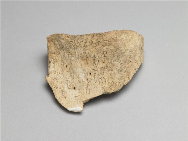 牛肩胛骨,正面有刻辭二十四個字,分為兩段,可能是兩次占卜的卜辭,反面有一鑽孔。