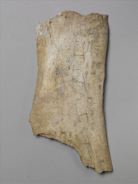 牛肩胛骨,正面有四個卜痕,依卜序數字看來應是分別占卜四件事。每個卜痕旁都有刻辭,從二到九字不等,反面有鑽鑿孔,有炙燒痕。