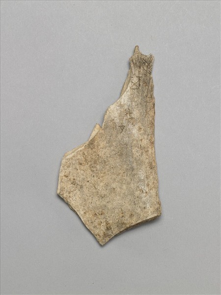 牛肩胛骨,正面有刻辭五到六字,背面邊緣有一炙燒痕。