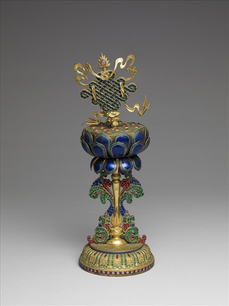 八吉祥中之盤長,因其盤繞不絕,象徵佛法永恆無止盡。盤長表面鑲嵌深綠料石,頂端帶一粉紅色寶石,並纏有飛揚飄逸之飄帶,挺立於寶藍色之蓮花上。花朵下接捲葉與蓮瓣座,皆鑲嵌光耀奪目之紅、藍、綠等各色料石。