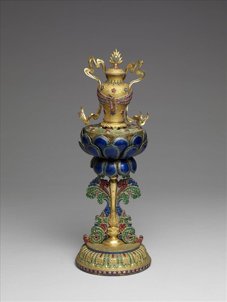 八吉祥中之寶瓶,象徵可裝盛淨水之容器。鍍金寶瓶密佈花葉紋,並鑲紅、藍、白料石製成之花朵紋包袱紋,瓶蓋上飾一綠寶石,並纏有飛揚飄逸之飄帶,挺立於寶藍色之蓮花上。花朵下接捲葉與蓮瓣座,皆鑲嵌光耀奪目之紅、白、藍、綠等各色料石。部分料石脫落。